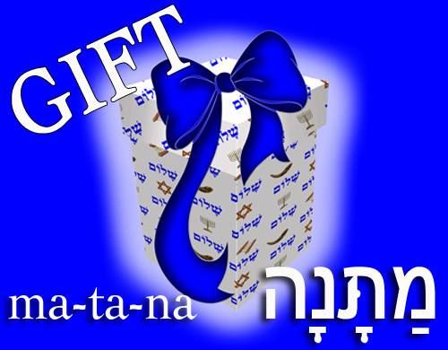 Grammar note: The shoresh (root) of this word is נתן (to give as a gift). The first nun is absent from this form because of assimilation — i.e. that, being a weak letter, it has transformed into a dagesh (doubling dot) in the following letter (taw) because of the addition of the mem prefix. This is common in Hebrew. Third-position heys tend to apocopate (disappear), and first-position nuns like to assimilate.